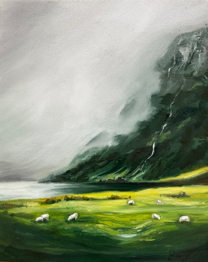 The image of sheep in a green meadow in the mountains in the mist is often associated with peace and tranquility. I wanted to create a painting that would give people a sense of relaxation and peace, allowing them to mentally transport themselves to this peaceful landscape. Mountain landscapes have always beckoned me with their beauty. I love their grandeur, majesty and vastness. The fog adds an atmosphere of mystery and magic to the landscape. I wanted to convey the sense of boundlessness and possibility that nature gives us. Painting this picture was a meditative process for me. I immersed myself in the world of nature, forgetting all my worries and concerns.