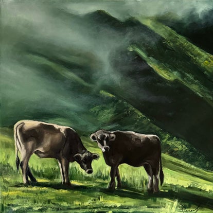 The painting depicts two cows peacefully grazing in a green meadow in the mountains.